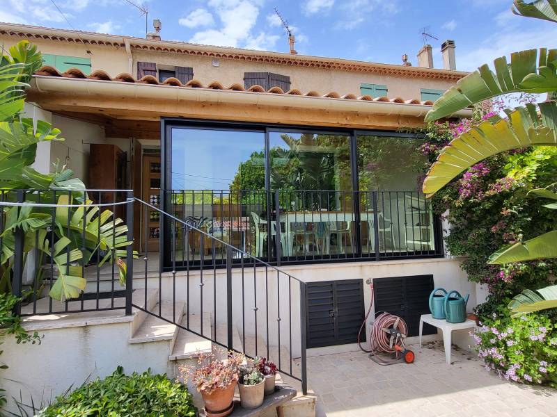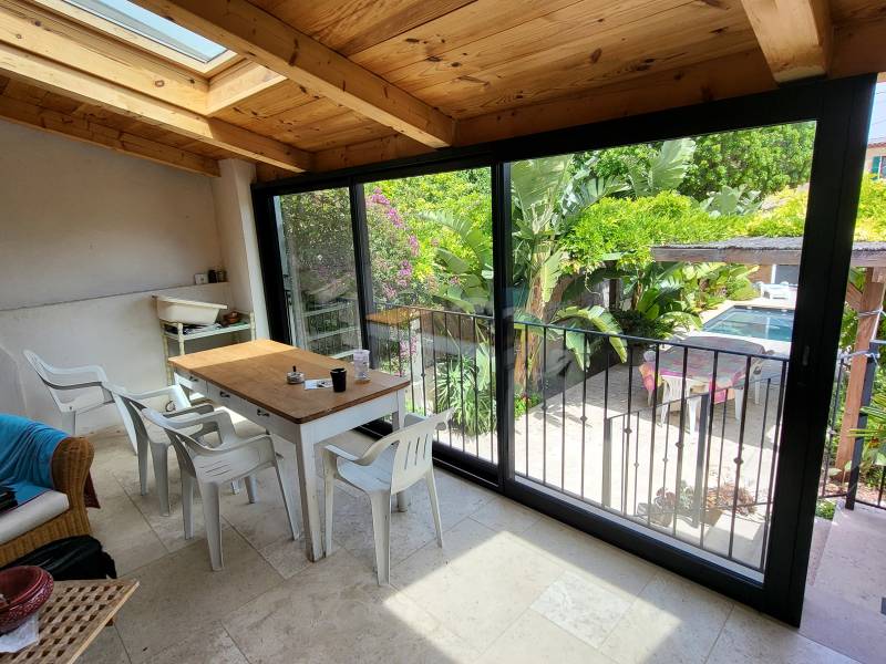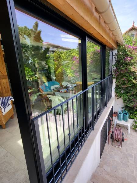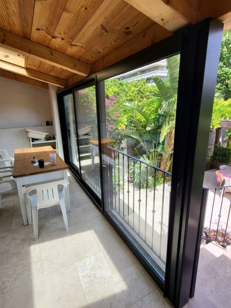 Nous vous présentons ici une réalisation trés aboutie d'une fermeturede terrasse réalisée en aluminium, avec un coulissant Aluminiumhaut de gamme ainsi qu'une porte lourde en Aluminium également. Ce chantier a été réalisé sur La Ciotat 13600.
