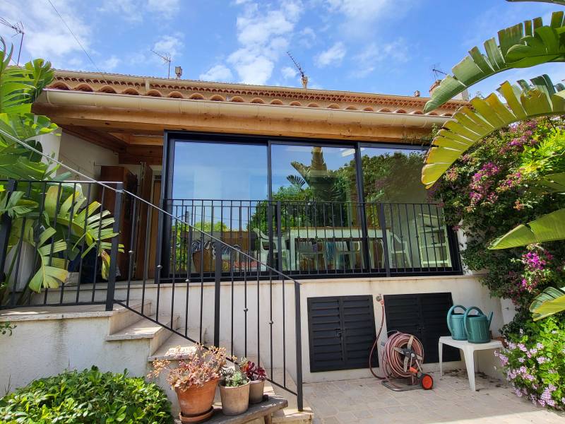 Nous avons utilisé un coulissant en Aluminium pour fermer cette terrasse afin tout d'abord, d'optimiser le clair de jour au maximum, et offrir la meilleure luminosité possible à notre cliente, ensuite il était nécessaire d'avoir une prise en main simple et optimale et de ce fait, l'aluminium a été le matériau le plus adapté. La porte agrémentée de ses 2 bâtons maréchal offrent une facilité d'utilisation et de confort à la fermeture.