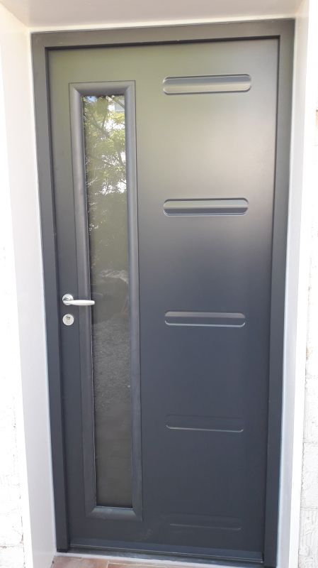 Le style original de cette porte en acier modernise totalement cette villa en pleine rénovation. Le panneau travaillé, le vitrage sablé ainsi que le laquage gris anthracite Ral 7016, font tout le charme de cette porte d'entrée en Acier laqué.