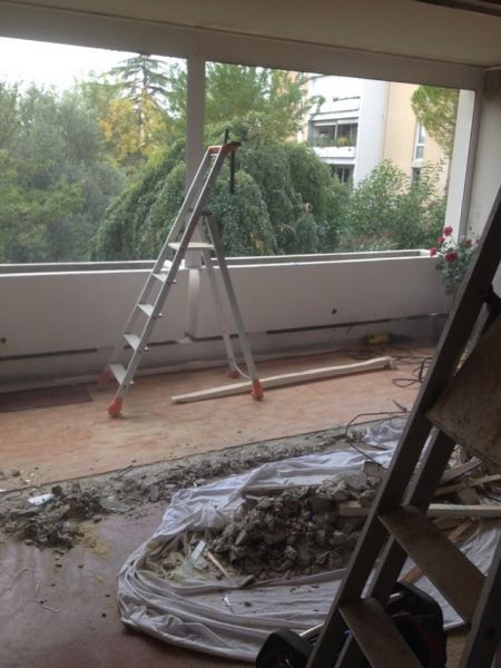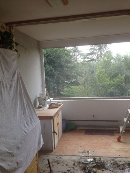 Nous avons procédé à une dépose totale de l'ancienne huisserie bois avec suppression de l'appui maçonné afin de bénéfécier d'un passage maximal de 5m60 sans marche à enjamber.