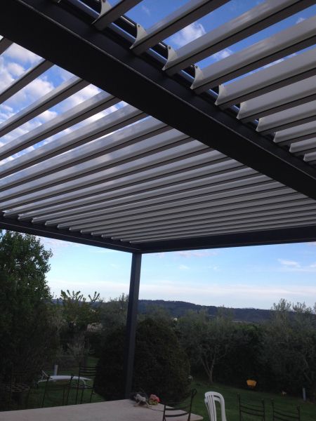 Cette pergola bioclimatique offre à nos clients la possibilité de profiter de leur terrasse par temps de pluie grâce a une toiture pourvue de lames orientables motorisées. L'étanchéité est parfaite, notamment grâce à un écoulement invisible qui se fait dans les montants de la pergola. L'orientation des lames permet la régulation de la température ambiante de la terrasse.