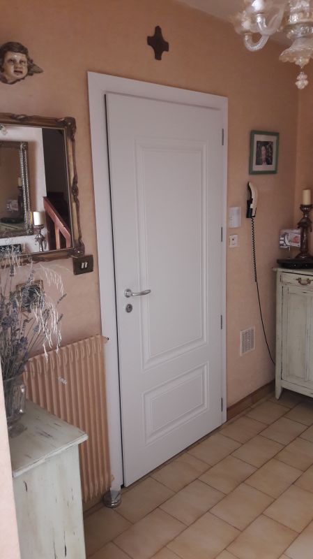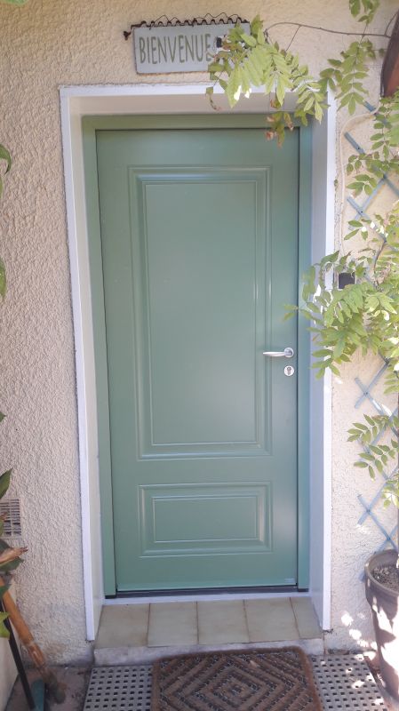 Cette porte d'entrée a été fabriqué en bicoloration blanc intérieur et vert Ral 601 extérieur afin de préserver l'aspect et le style de cette maison des années 80. Le panneau travaillé fait tout le charme de cette menuiserie en Acier laqué.