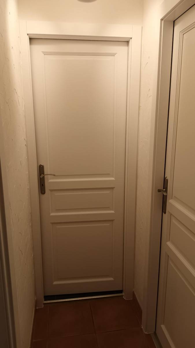 Ces portes d'intérieurs fabriquées en France, en sur-mesure sont des portes en bois massif, laquées en blanc mat 9010 à la demande de nos clients et posées en rénovation, sans aucun dégâts.