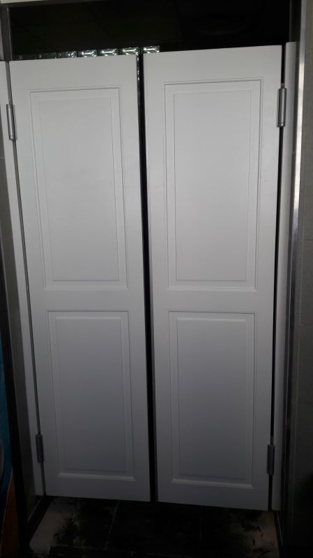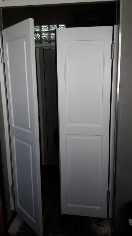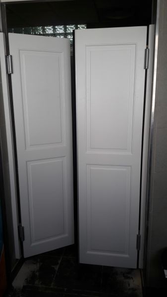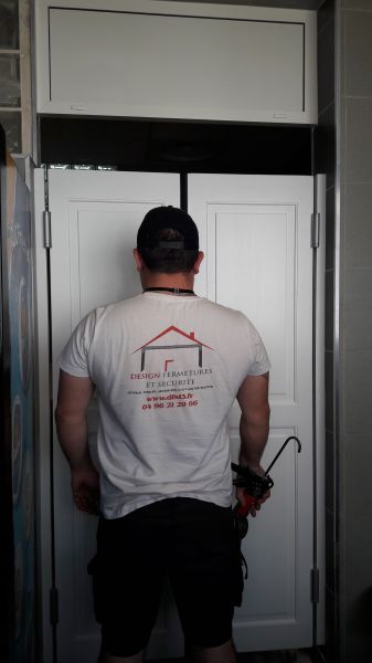 A la demande nos clients nous avons dessiné, créé et fabriqué sur mesure ce volet bois en porte western avec charnières va-et-vient, joint central anti pince doigt et laquage 3 couches blanc 9010.
