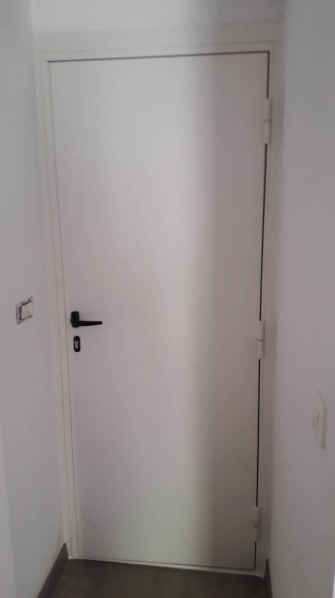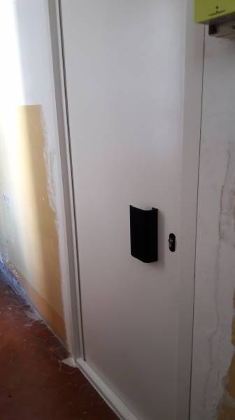 Cette porte a été fabriquée sur mesure, en acier laqué Blanc Ral 9010. Les dimensions exceptionnelles de cette porte nous ont obligé à une conception particulière avec une isolation thermique, des renforts intérieurs en omégas verticaux, une serrure 3 points avec poignée aileron de tirage extérieure et un laquage sablé polyzingué.