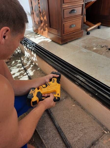 Nous avons installé un immense coulissant 3 vantaux de 4m60 de large ainsi qu'un ensemble composé d'un trapèze, d'un coulissant 2 vantaux et d'un chassis fixe en aluminium afin de fermer totalement cette terrasse de 10 m2. Grâce à l'isolation optimale de ces nouvelles menuiseries haut de gamme en Aluminium, notre cliente bénéficie désormais d'une toute nouvelle pièce "à vivre", totalement protégée du froid et du bruit extérieur.