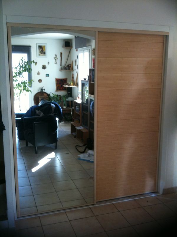 Les propriétaires ont choisi un modèle de portes coulissantes profil aluminium, avec miroir argent d'un côté et panneau lambris clair de l'autre. L'harmonie est parfaite.